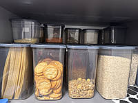 Позбавився від пакетиків, надійніше від комах та тарганів, можна ставити один на оден. За таку ціну така кількість судків та їх розмір - майже безкоштовно (якщо не вразовувати трохи грошенят). Знахідка для кухонного побуту.