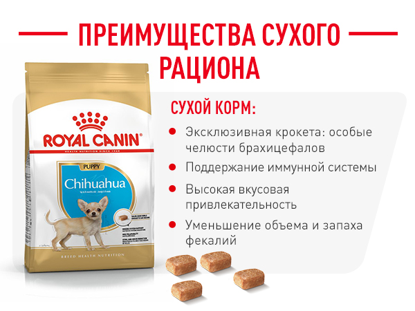 ВЫСОКАЯ ВКУСОВАЯ ПРИВЛЕКАТЕЛЬНОСТЬРацион CHIHUAHUA PUPPY удовлетворяет аппетит чихуахуа благодаря сочетанию трех факторов: адаптированный размер и форма крокеты, эксклюзивная рецептура и подобранные ароматы.