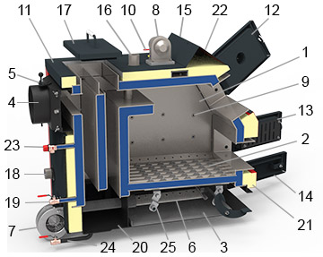 1. камера сгорания (топка); 2. решетка колосниковая; 3. камера поддувала (зольник); 4. дымоход; 5. шибер газохода поворотный; 6. рассекатель первичного воздуха; 7. вентилятор первичного воздуха с шибером регулировки; 8. вентилятор вторичного воздуха; 9. форсунки вторичного воздуха; 10. шибер регулировки вторичного воздуха; 11. кожух декоративный; 12. люк загрузочный; 13. люк выгребной; 14. люк удаления пепла; 15. пульт управления; 16. патрубок подачи; 17. люк чистки дымовых каналов; 18. патрубок обратки; 19. патрубок слива с шаровым краном; 20. люк удаления сажи; 21. шар теплоизоляции; 22. манометр; 23. клапан предохранительный; 24. патрубок слива конденсата.