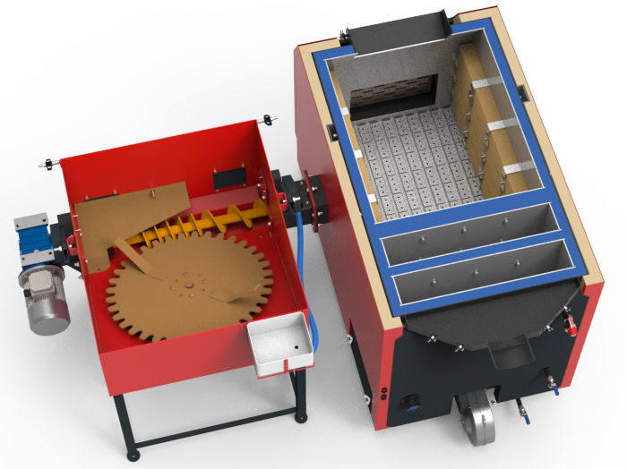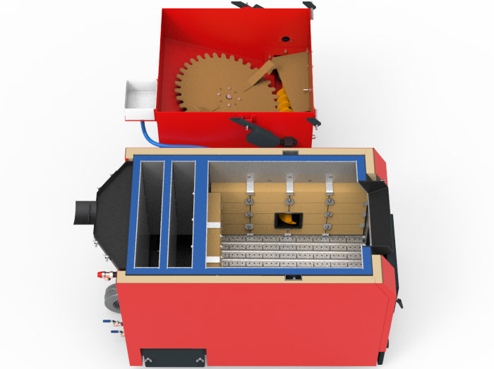 Автоматизированный котел, оснащенный бункером объемом 0,6 м³, предназначен для подачи щепы, опилок, шелухи, зерновых культур, агроотходов и подобного сырья. При необходимости объем бункера легко увеличивается до 1 м3, 1,5 м3 и более путем установки надставок на основную емкость.