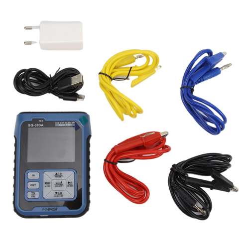 - Комплектация: генератор сигнала FNIRSI SG-003A, четыре тестовых кабеля-клипсы, кабель для зарядки USB Type-C, адаптер питания 5В 1А, а также инструкция на английском языке.