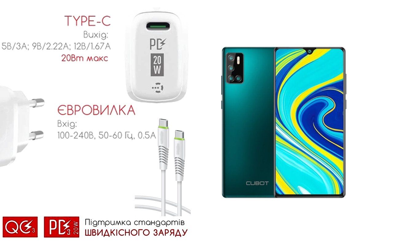 Quick Charger 20W 3A для смартфона Cubot P40, Быстрая зарядка