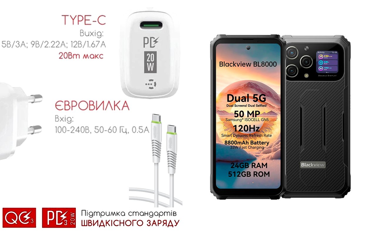 Мобильный телефон Blackview BL8000 с возможностью зарядки от USB Type-C порта |