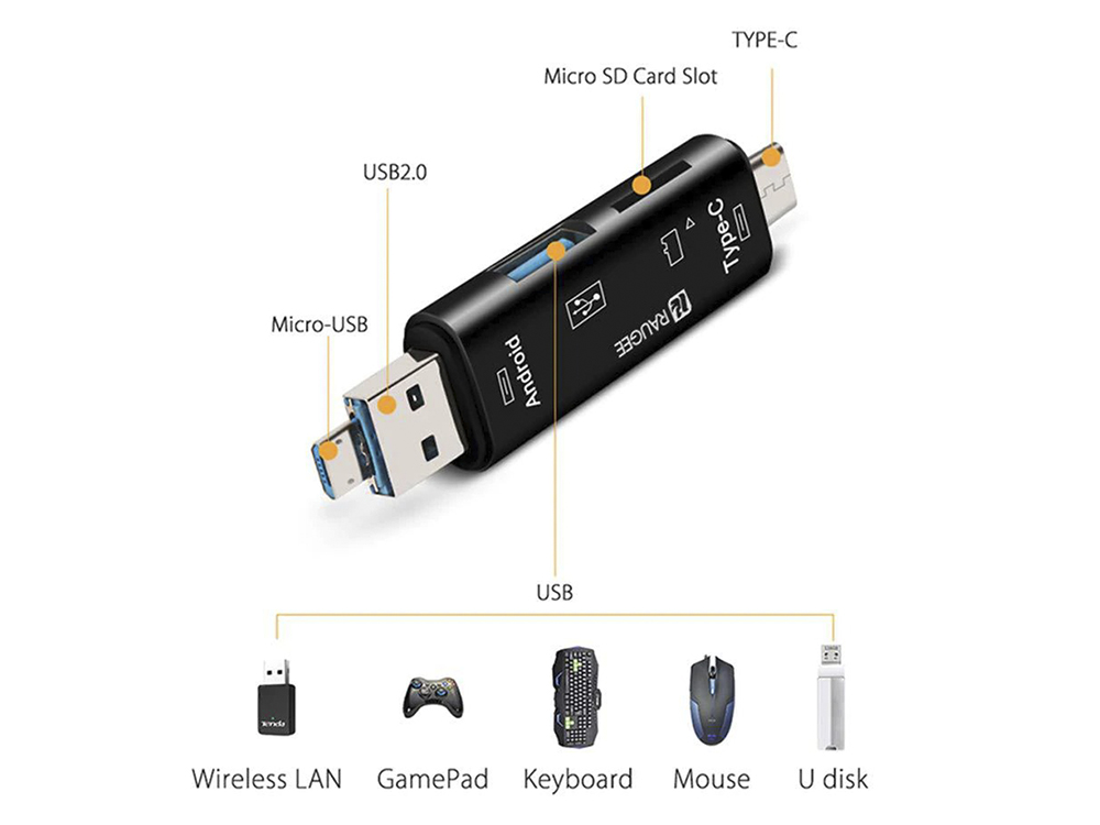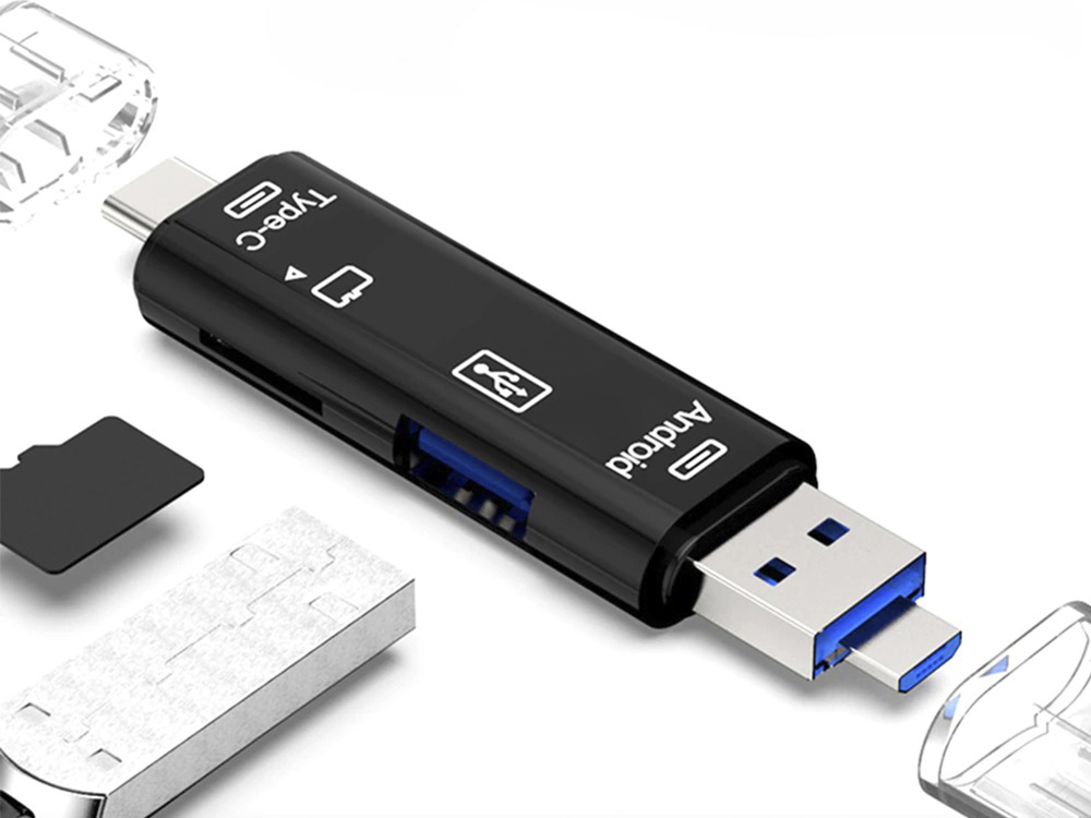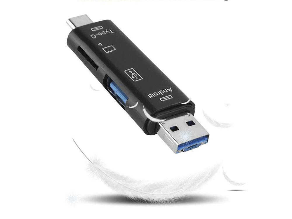 Кард-ридер 5 в 1 Micro USB Type-C USB USB 2.0 MicroSD(TF) - это универсальный кардридер с множеством портов: Micro USB Type-C USB USB 2.0 MicroSD(TF). Кардридер можно использовать как флешку, если вставить TF- карту.