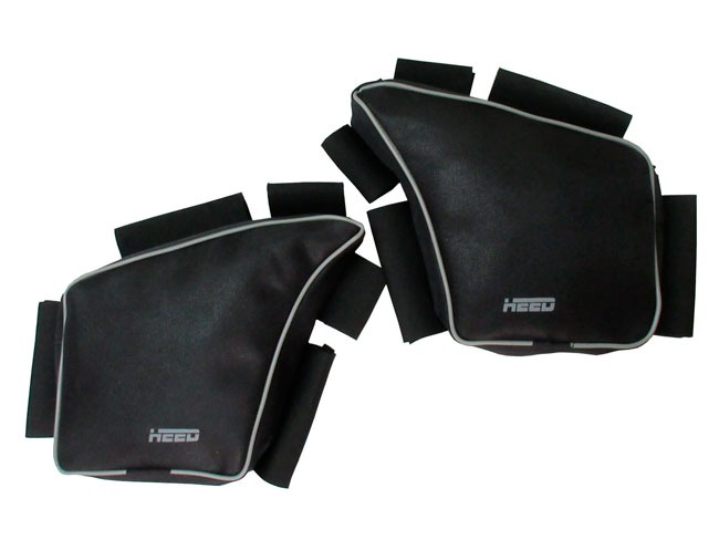 Они крепятся с помощью лямок, застегивающихся на липучку.Сумки однокамерные, вставляются в отверстия защитной дуги HEED и очень хорошо сочетаются с внешним видом.