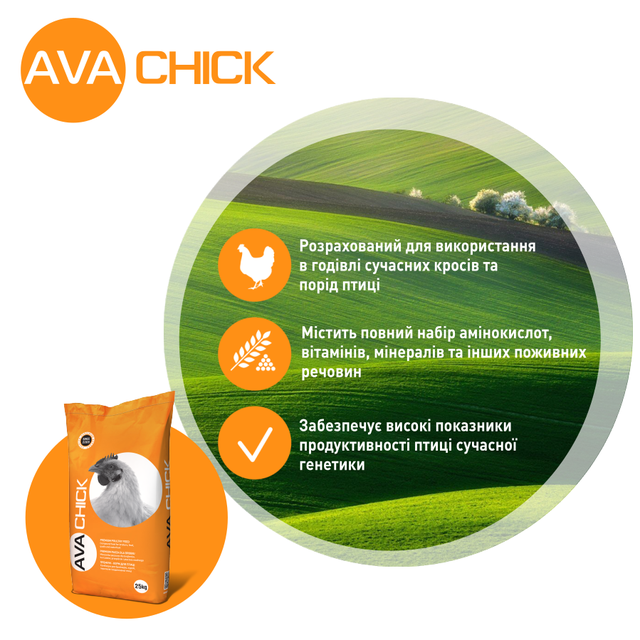 Линейка продуктов AVA CHICK была разработана ведущими нутриционистами согласно всем требованиям к нормированию кормления птицы. Для приготовления кормов и кормовых добавок используются качественные европейские составляющие, которые помогают раскрыть продуктивный генетический потенциал птицы и обеспечить высокие показатели эффективности выращивания цыплят-бройлеров на каждом этапе кормления