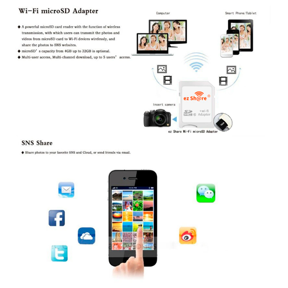 MicroSD WiFi адаптер ez Share SD карт с передачей данных по Wi-Fi - это высокотехнологичный Wi-Fi адаптер, который позволит Вам передавать файлы с любого подключенного устройства (фотоаппарат, планшет, мобильный телефон) по технологии Wi-Fi на любое другое устройство под управлением iOS, Android или Windows.