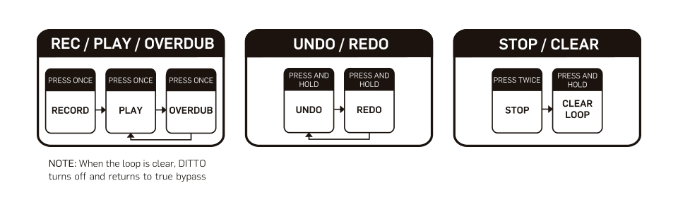DITTO LOOPER робить петлю таким же простим, як 1-2-3. Настільки легкий у налаштуванні та простий у використанні, DITTO LOOPER робить керування інтуїтивно зрозумілим, але гнучким, тож ви можете зосередитися на найважливішому: грі та виступі. Ви натискаєте один раз, щоб записати, натисніть ще раз, щоб відтворити цикл. Натисніть один раз, щоб додати ще один шар звуків, який можна повторювати, доки не закінчаться ідеї. Ви навіть можете скасувати або повторити шар, натиснути двічі, щоб зупинити, або натиснути й утримувати, щоб очистити петлю.