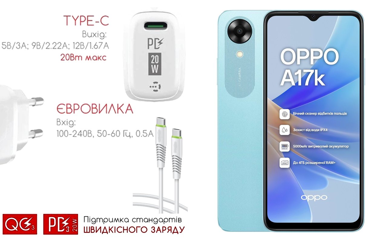 Мобильный телефон OPPO A17k с возможностью зарядки от USB Type-C порта |