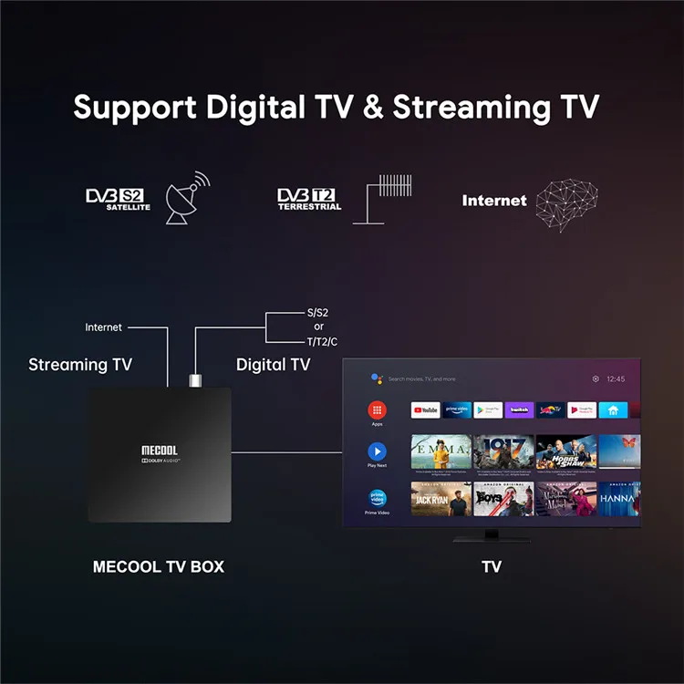 Смарт ТВ приставка Mecool KT1 использует последнее поколение чипсета SoC Amlogic S905X4-B, в качестве платформы, которая одним из первых имеет встроенную поддержку кодека AV1. Особенностью данной приставки является наличие встроенного тюнера DVB T2, позволяющего получить доступ ко всем телеканалам, при подключении спутниковой ТВ-антенны.