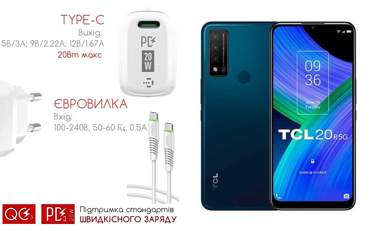 Мобильный телефон TCL 20R 5G с возможностью зарядки от USB Type-C порта |