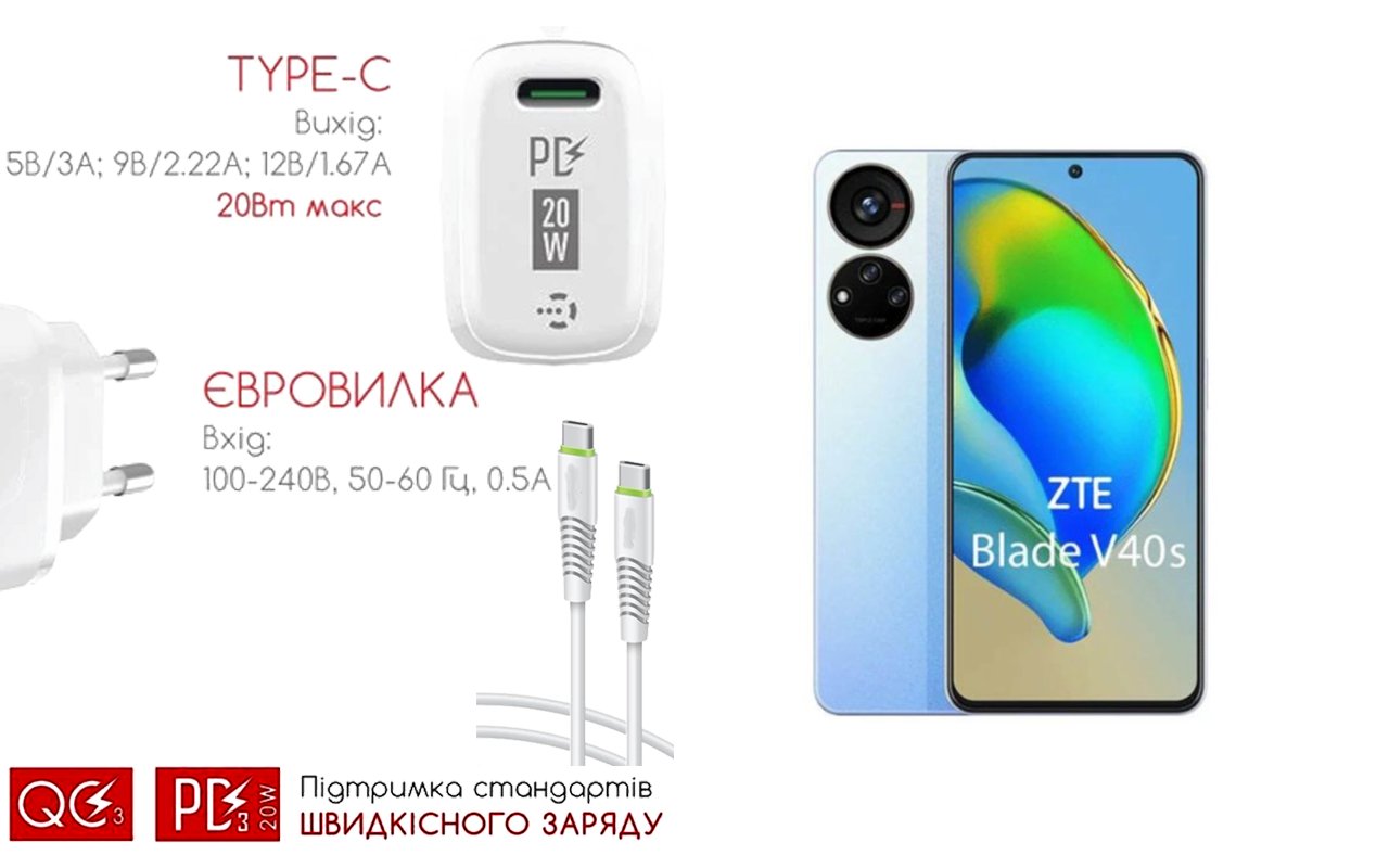 Quick Charger 20W 3A для смартфона ZTE BLADE V40s, Быстрая зарядка