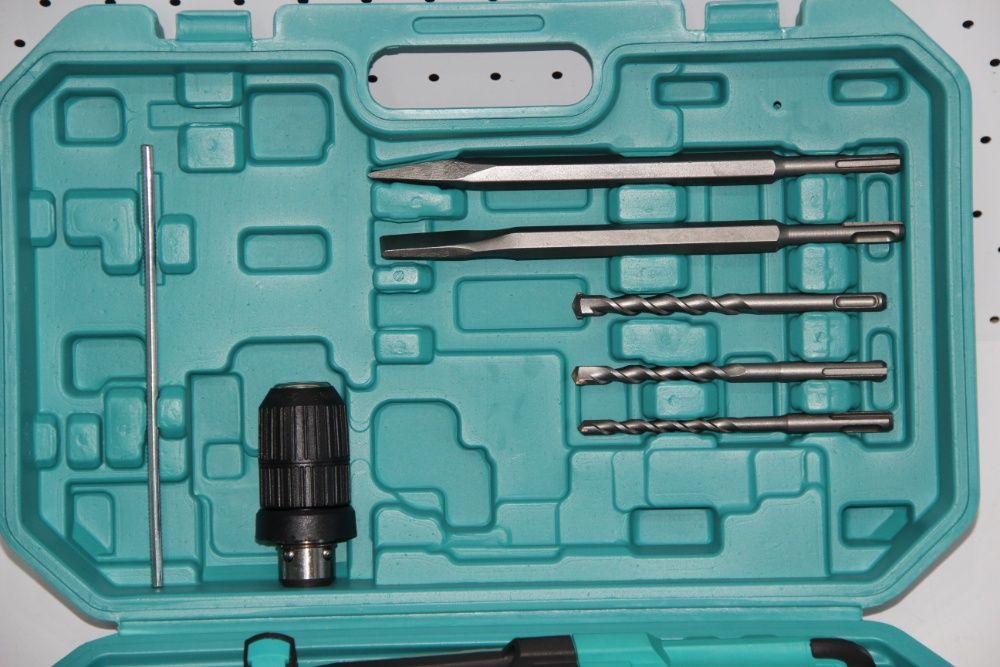 Перфоратор имеет очень прочный корпус, редуктор и ударный механизм защищены прочной металлической оболочкой. В комплект поставк входит очень удобный транспортировочный кейс.