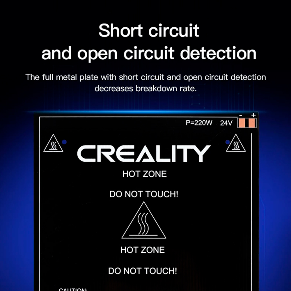 Платформа Creality с подогревом для принтера 3д Ender-3 Ender-3 V2 - это подогреваемая платформа от Creality, предназначенная для моделей 3D-принтеров Ender-3 и Ender-3 V2, является отличным выбором для тех, кто стремится к улучшению качества и точности своих 3D-печатей. Платформа оснащена алюминиевой пластиной с высокой теплопроводностью, что обеспечивает равномерное распределение тепла по всей рабочей поверхности. Это способствует более точному и стабильному прикреплению первого слоя, уменьшая риски деформации и улучшая общую точность печатных изделий. Прочность материалов гарантирует долговечность использования платформы даже при ежедневной интенсивной эксплуатации. Такая надежность важна для тех, кто ожидает от своего оборудования максимальной производительности на протяжении многих лет. В дополнение к техническим характеристикам, платформа имеет четко обозначенную зону предупреждения с надписями, которые предотвращают случайное прикосновение к горячим элементам, тем самым обеспечивая безопасность пользователя.