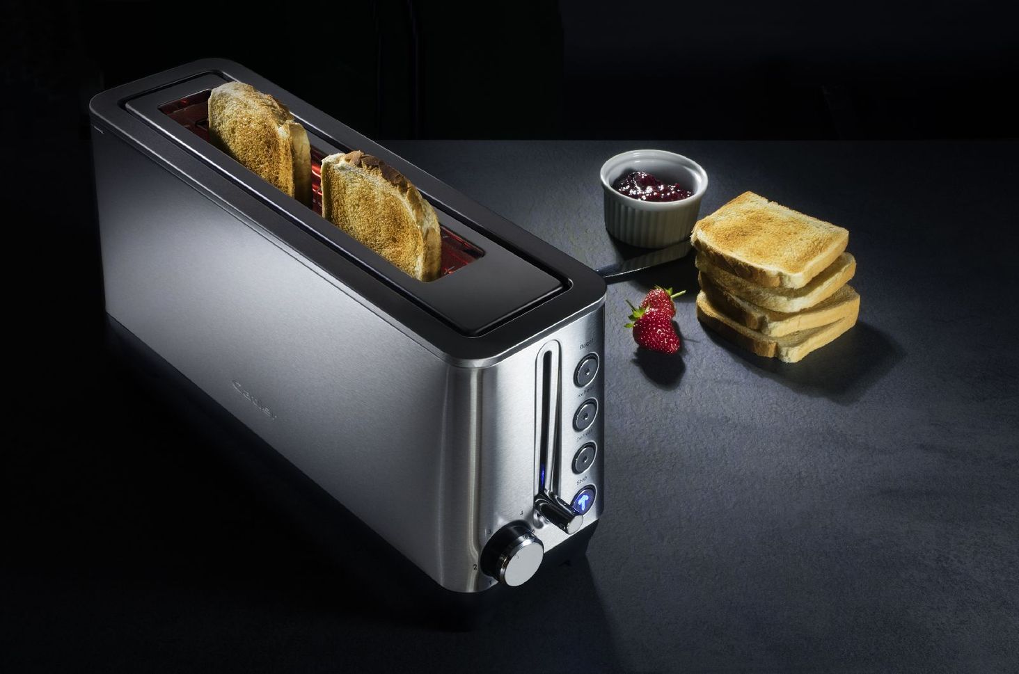 Catler представляет новый тостер с возможностью поджаривания 2 тостов рядом или целых ломтиков хлеба или багетов в течение очень длительного времени. Несмотря на это, он очень компактен и удобен в хранении, его можно держать под рукой на кухонной стойке. Простой дизайн из матовой стали с кнопками с синей подсветкой будет заметен на каждой кухне.