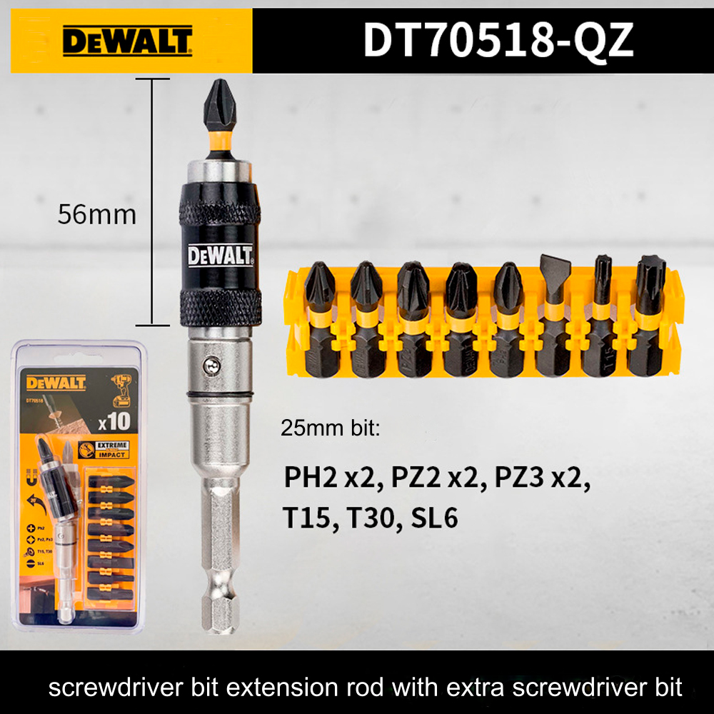 Держатель бит DeWalt с подвижной головкой и набором бит 10 шт. - универсальный адаптер Dewalt с подвижной головкой и дополнительной битой предназначен для удобной работы с электрическими дрелями и шуруповертами. Он обеспечивает легкий доступ к труднодоступным местам и позволяет надежно удерживать биты благодаря мощному магнитному кольцу.