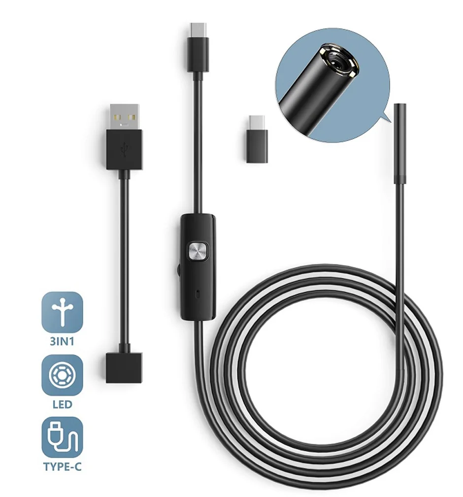 • Функциональность 3-в-1: эта эндоскопическая камера объединяет в себе разъем micro USB Type C, бороскоп и мини-камеру, что делает ее универсальным инструментом для различных видов осмотра.