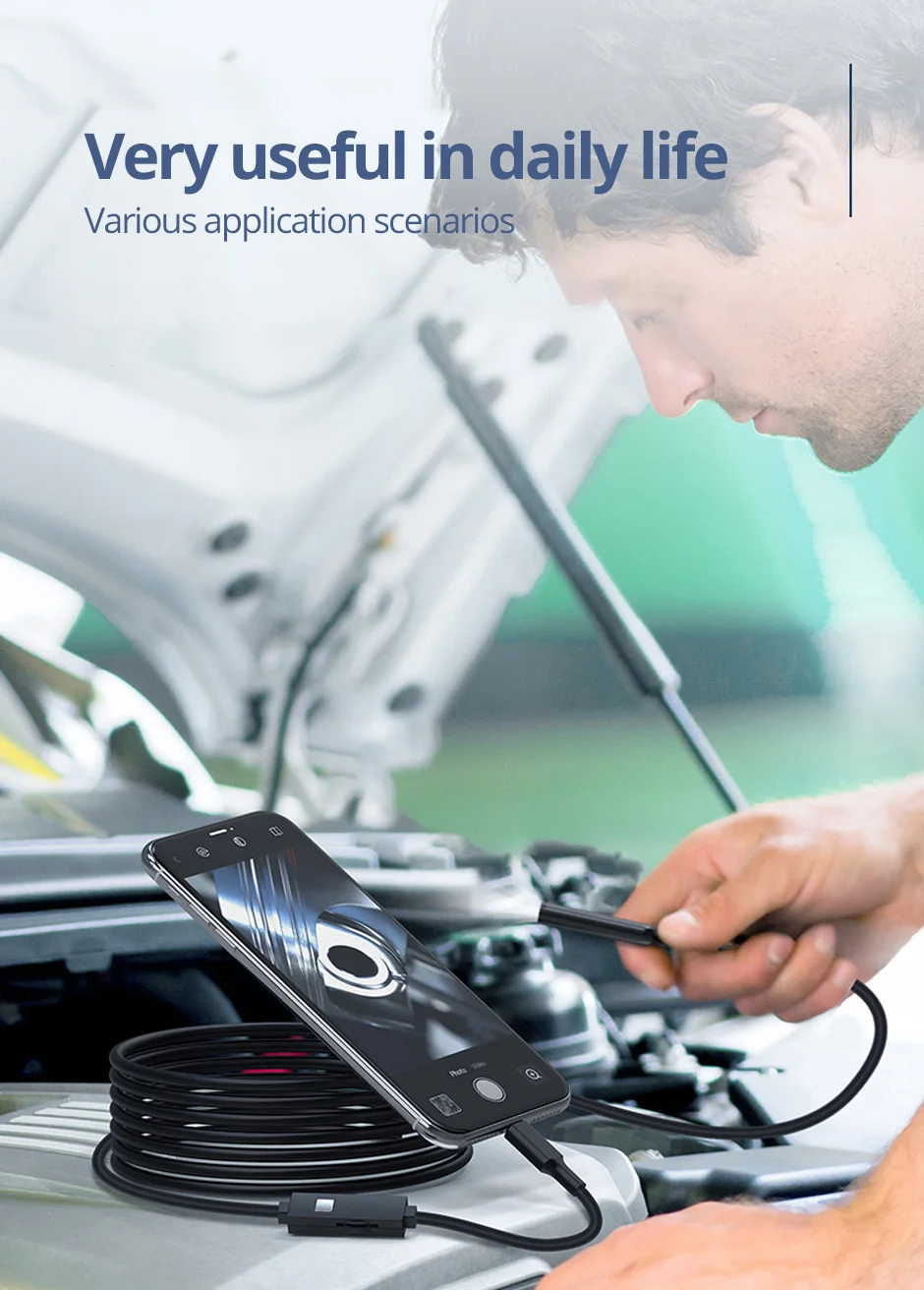 • Водонепроницаемая конструкция: эта эндоскопическая камера, разработанная с учетом защиты от воды, идеально подходит для использования на открытом воздухе или во влажной среде, гарантируя надежную работу.