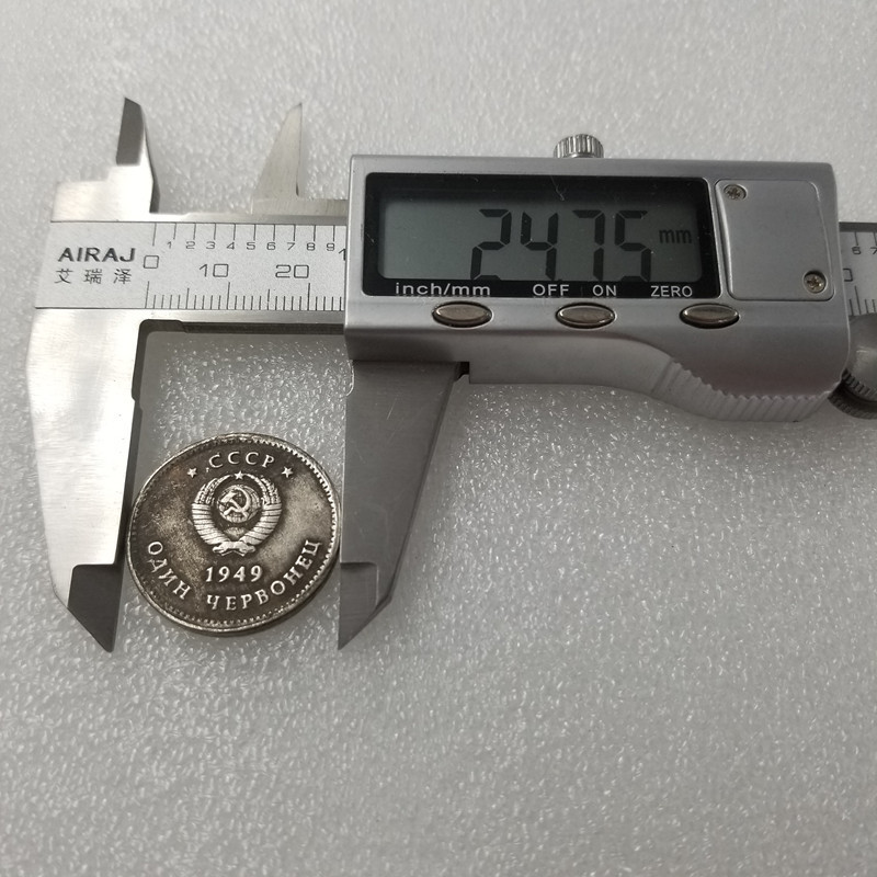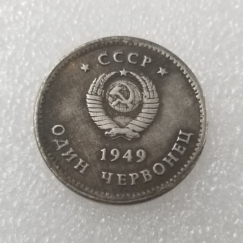 На лицевой стороне пробной монеты Червонец 1949 года СССР, изображен сдвоенный портрет Ленина и Сталина в профиль. На оборотной стороне герб СССР, внизу полукругом номинал и год выпуска монеты.