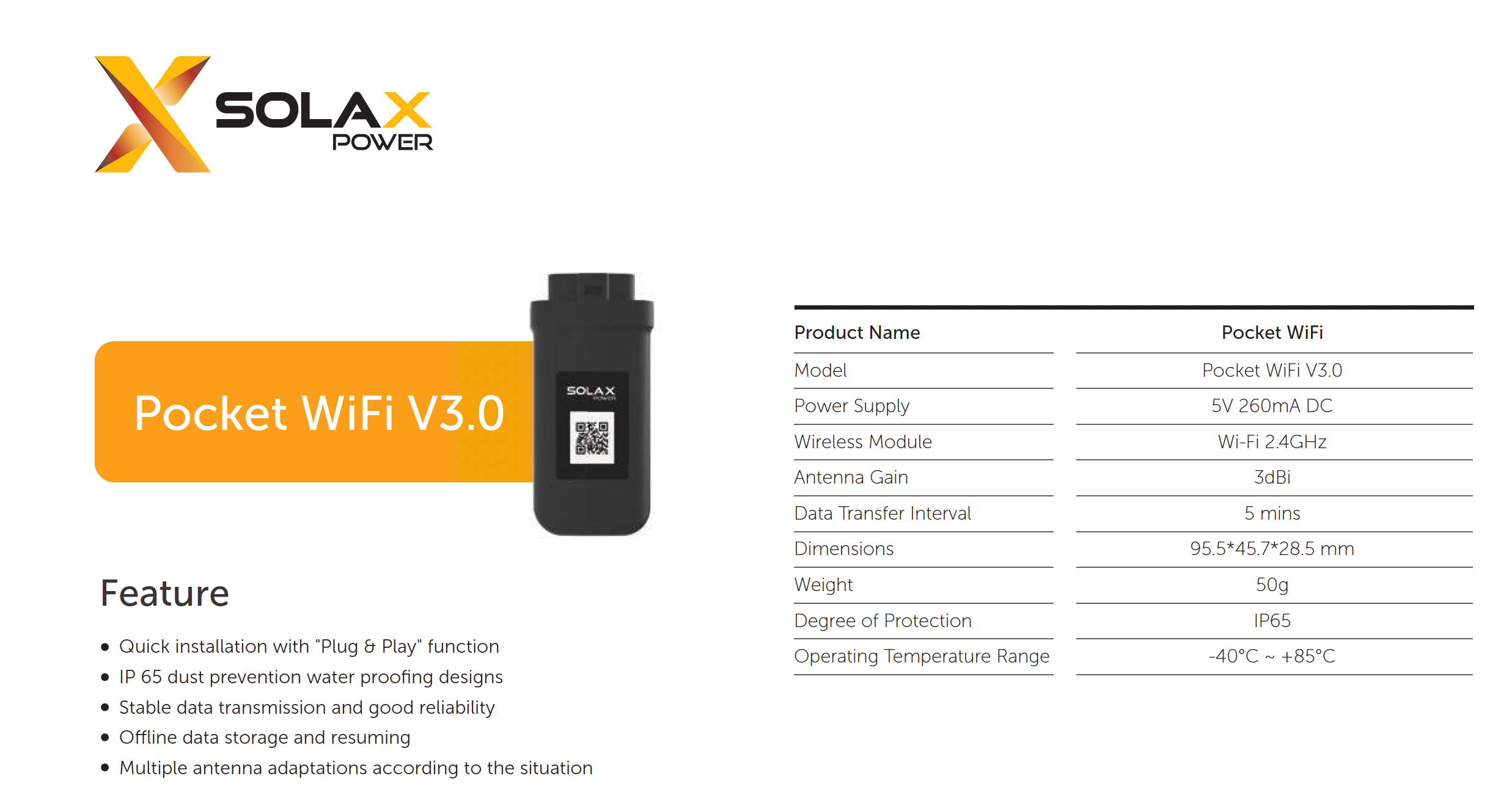 Устройство работает через WiFi-соединение на частоте 2.4 ГГц, что дает возможность удаленно следить за производительностью системы через облачную платформу SolaX Cloud, доступную как через мобильное приложение, так и через веб-браузер. Антенна с усилением 3 дБи обеспечивает стабильную передачу данных, а функция сохранения данных при потере соединения гарантирует, что важная информация не будет утеряна. Передача автоматически возобновляется после восстановления связи.