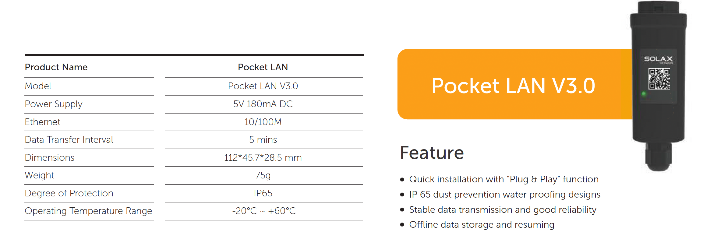 Модуль Solax Power PROSOLAX Pocket LAN V3.0 обеспечивает быстрое подключение благодаря функции "Plug & Play", что позволяет без труда интегрировать его в вашу солнечную систему. Этот компактный прибор станет отличным решением для тех, кто стремится контролировать работу своей солнечной установки, гарантируя надежную передачу данных.