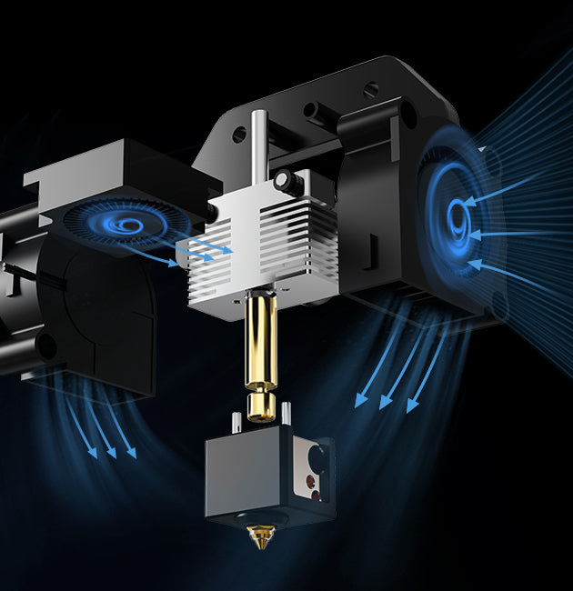 Окрім двох потовщених вентиляторів охолодження з кульковими підшипниками 4015 з обох боків друкуючої головки, за друкуючою головкою розташовані чотири допоміжні вентилятори з кульковими підшипниками 4020, що забезпечує всеспрямоване швидке охолодження щойно надрукованих шарів навіть за високої швидкості друку, а нанесений гарячий філамент швидко з'єднується для кращих результатів звисання та перекриття.