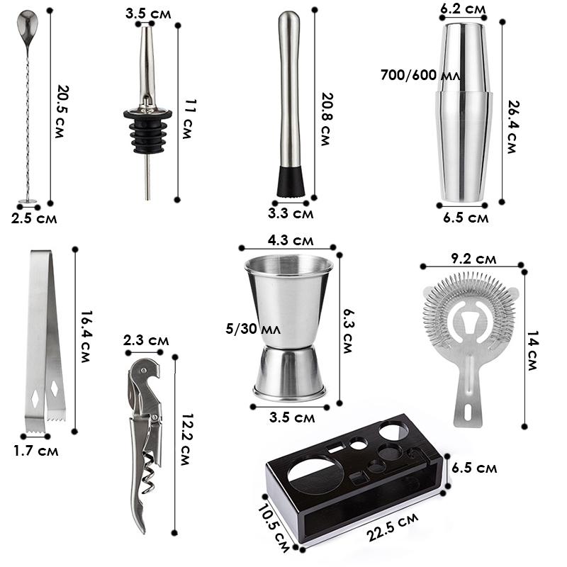 | Тип назначения | Набор для бара из 10 предметов с шейкером 700/600 мл на подставке для приготовления коктейлей, Барный набор |