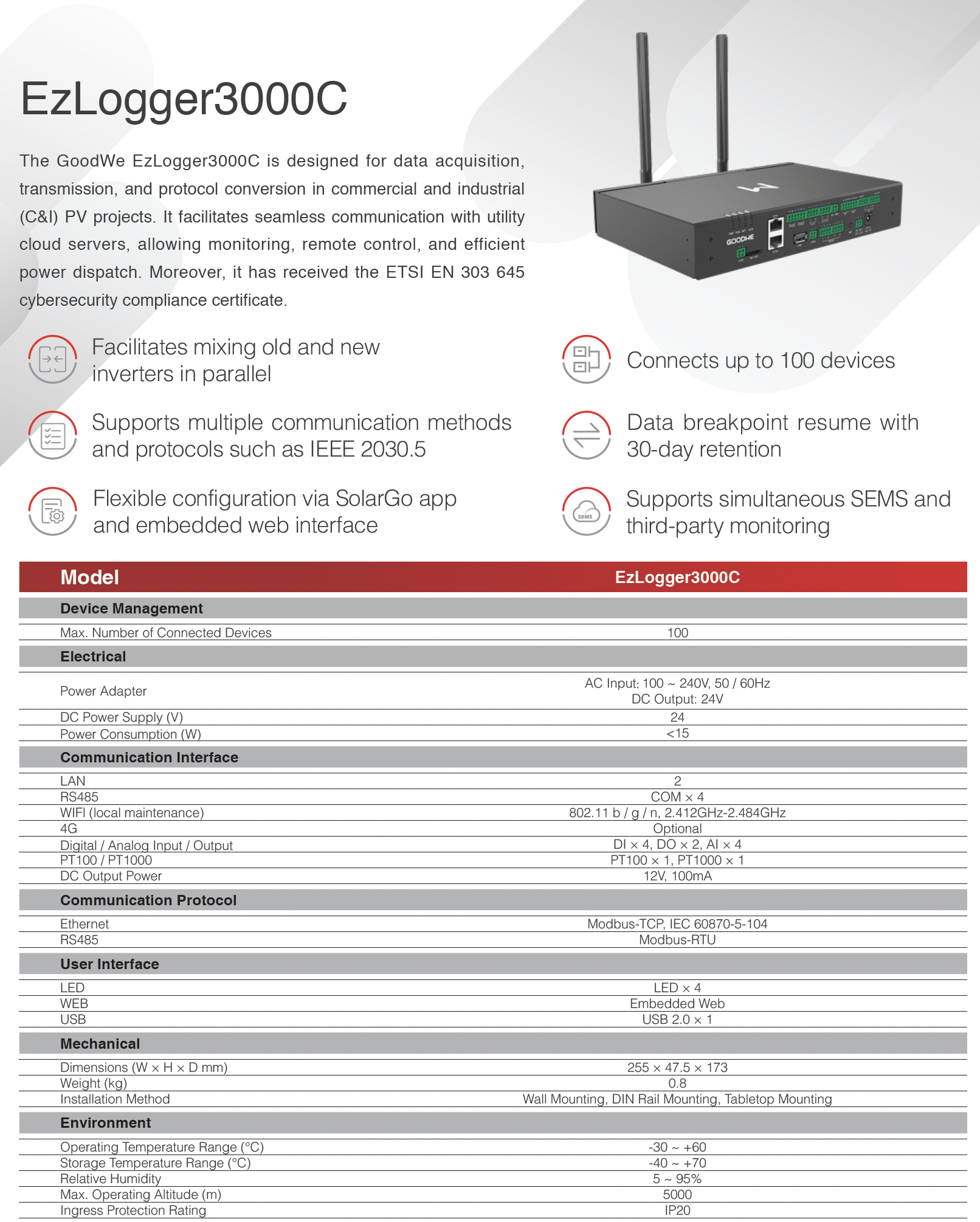 Это компактное устройство идеально подходит для крупных установок, где требуется интеграция разнообразного оборудования, включая как современные, так и устаревшие инверторы, без необходимости в сложной перестройке системы. Благодаря поддержке множества протоколов и гибким настройкам через мобильное приложение SolarGo или встроенный веб-интерфейс, упрощает повседневные операции и минимизирует риски простоев. Кроме того, модель соответствует строгим стандартам кибербезопасности, что гарантирует защиту данных от внешних угроз в условиях растущей цифровизации энергосетей.