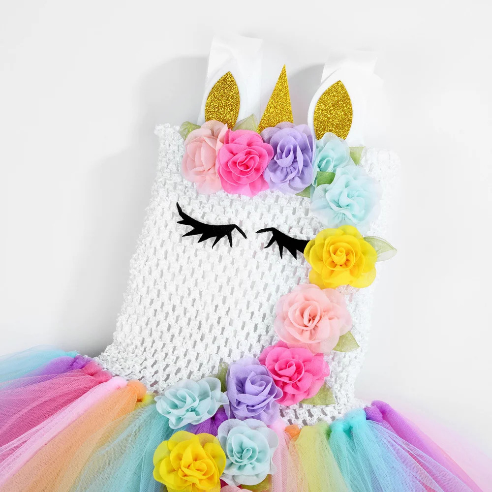 Очаровательное платье для девочек в стиле единорога с LED-подсветкой станет идеальным нарядом для праздников. Выполнено в пастельных радужных оттенках с украшением из цветов, рога единорога и ушек. Такой образ придаст ребёнку сказочности и волшебства, создавая атмосферу настоящего праздника.