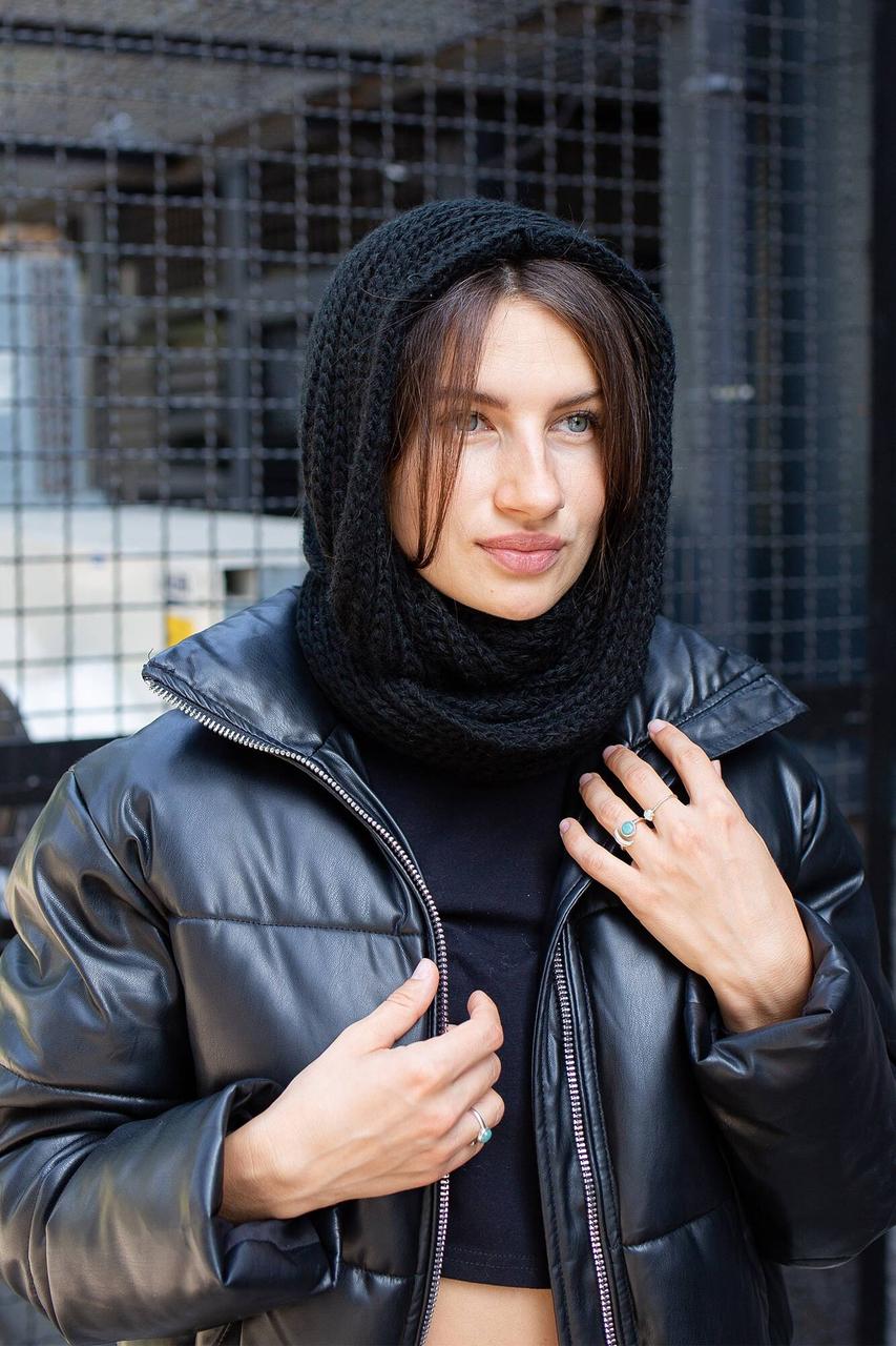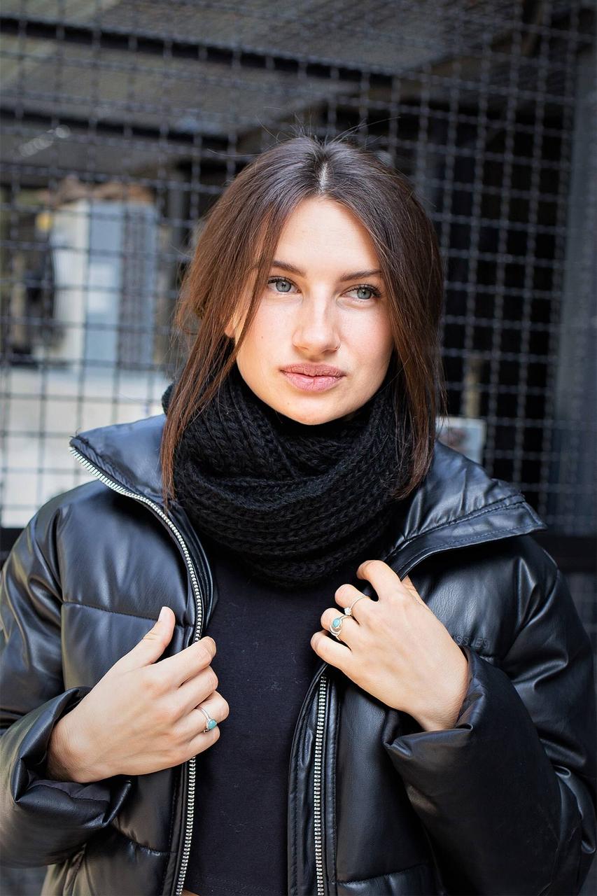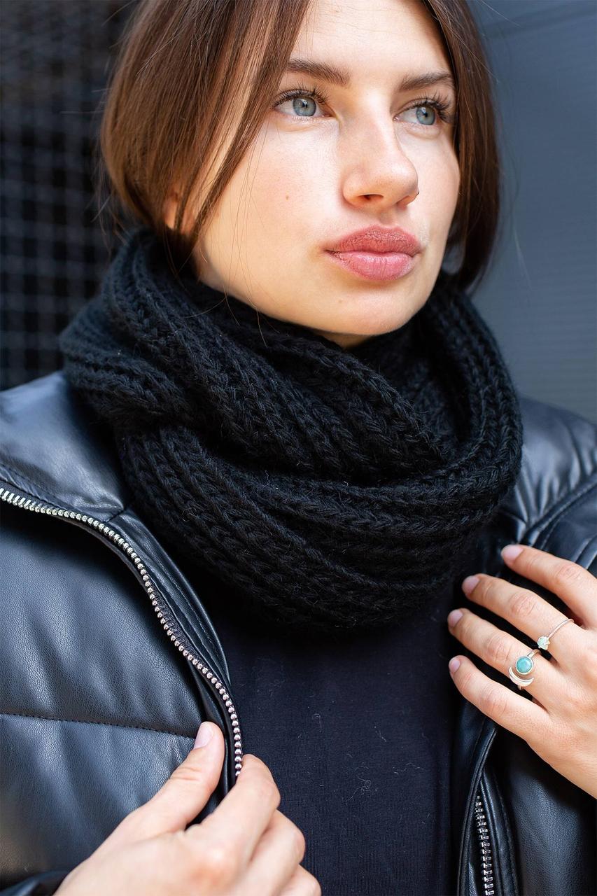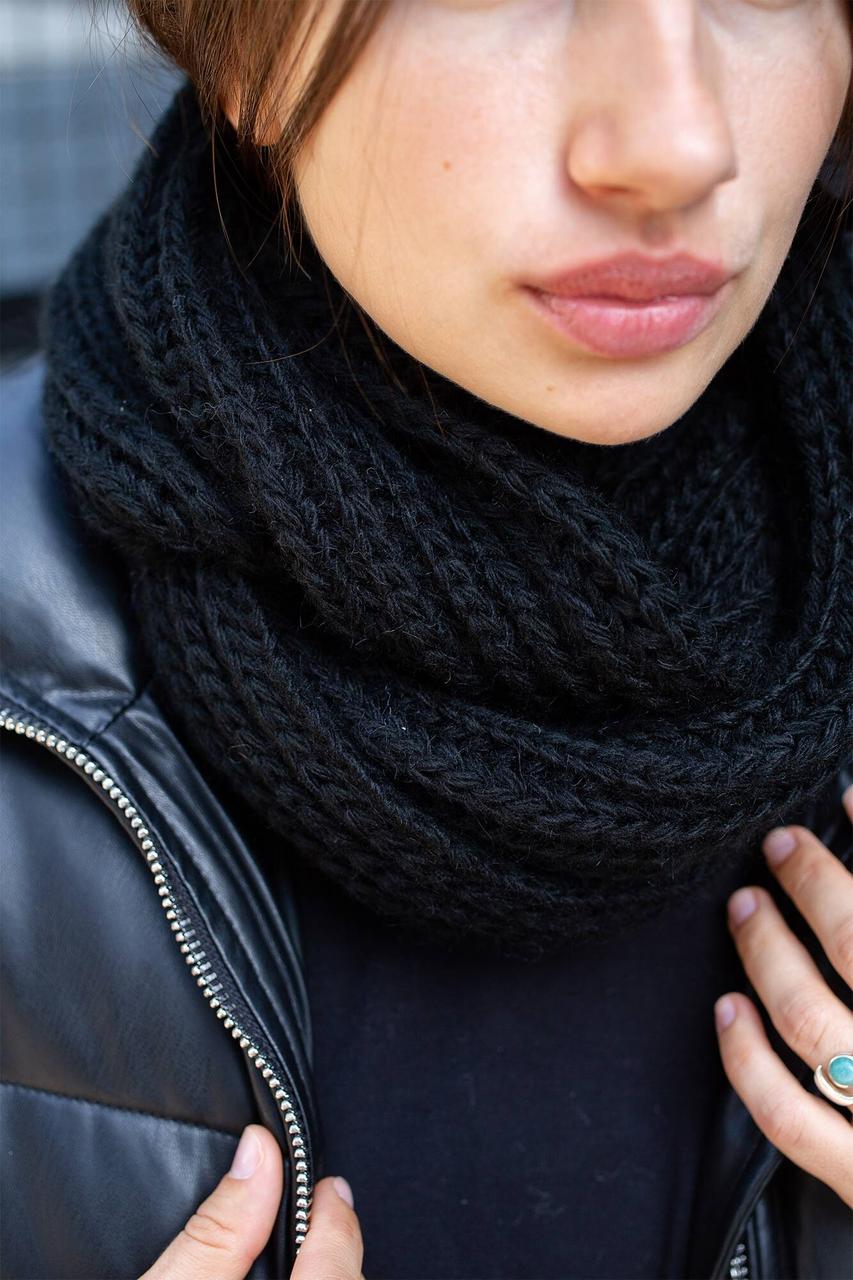 Благодаря своей конструкции шарф легко одевается и снимается, а также может быть использован как снуд. Он прекрасно защищает шею от холодного ветра, снега и дождя, что делает его незаменимым в зимний период. Черный цвет без узоров позволяет комбинировать его с любой одеждой, что делает ее универсальным дополнением к вашему гардеробу.