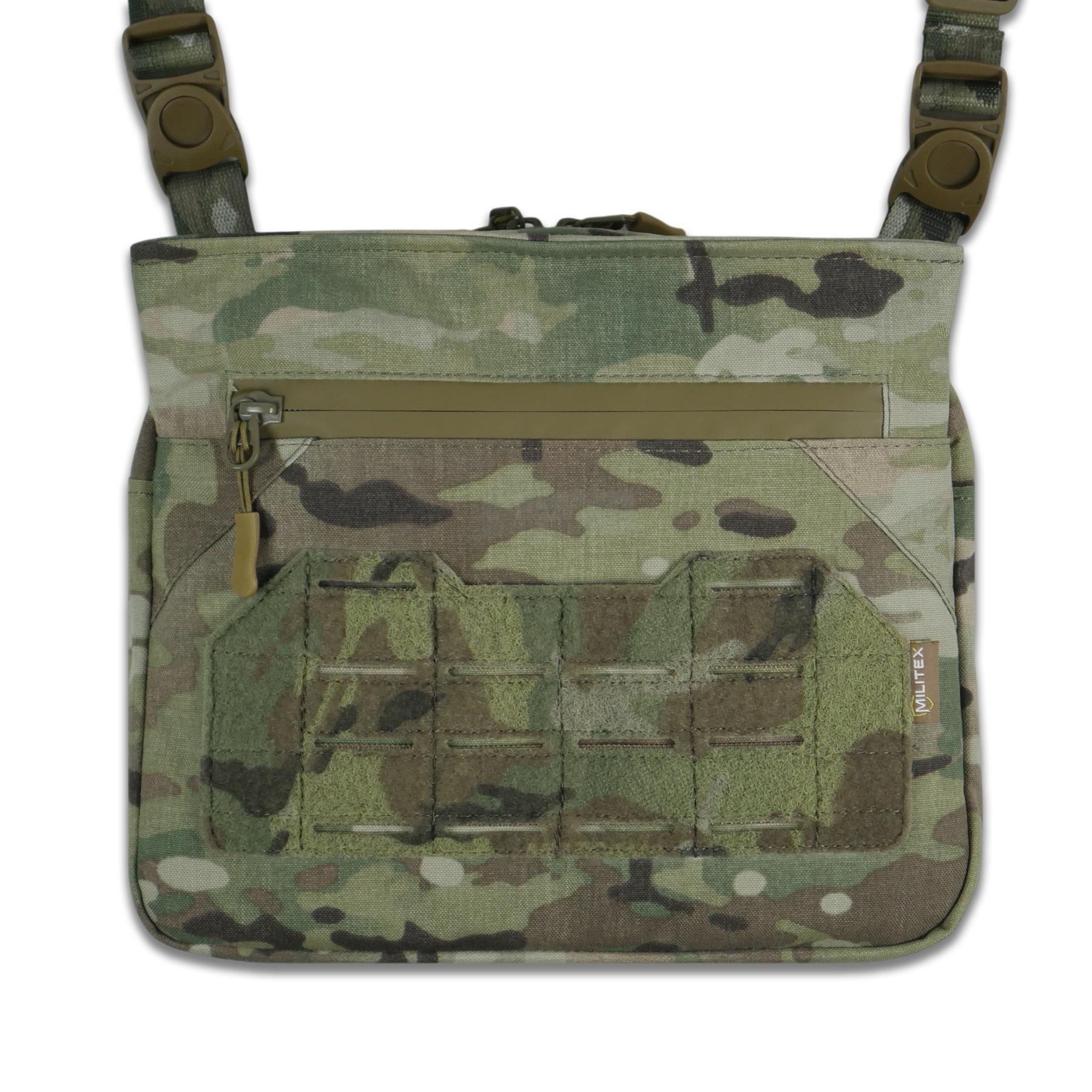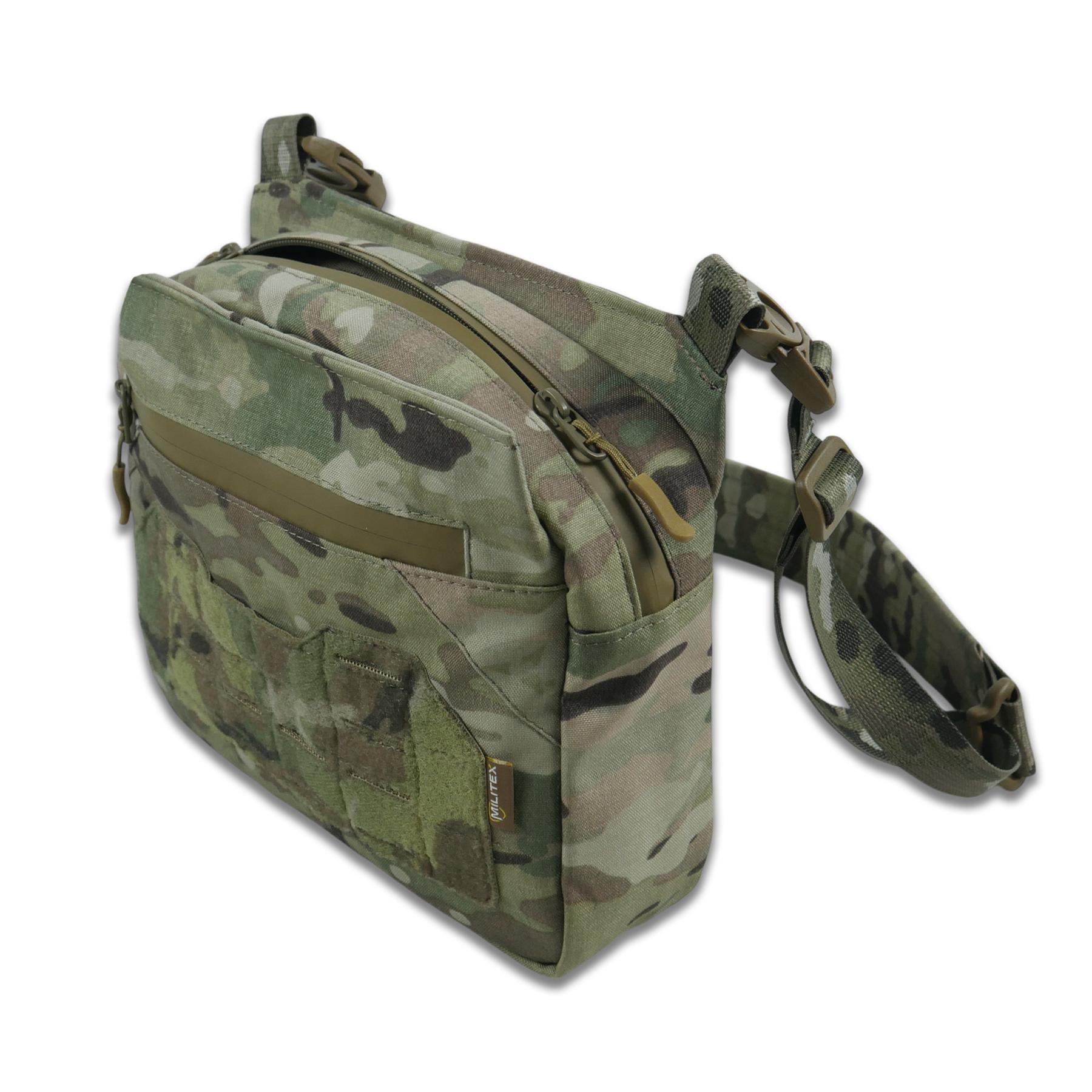 Основной отдел сумки содержит карман на молнии, пять эластичных трикотажных карманов для аптечки, мультитула, документов и открытый разделенный отсек для быстрого доступа. Передний отдел имеет карабин для ключей и секции для карт, ручек, наушников и мелочей. MOLLE-система и Velcro позволяют крепить патчи, итоги или дополнительные модули.