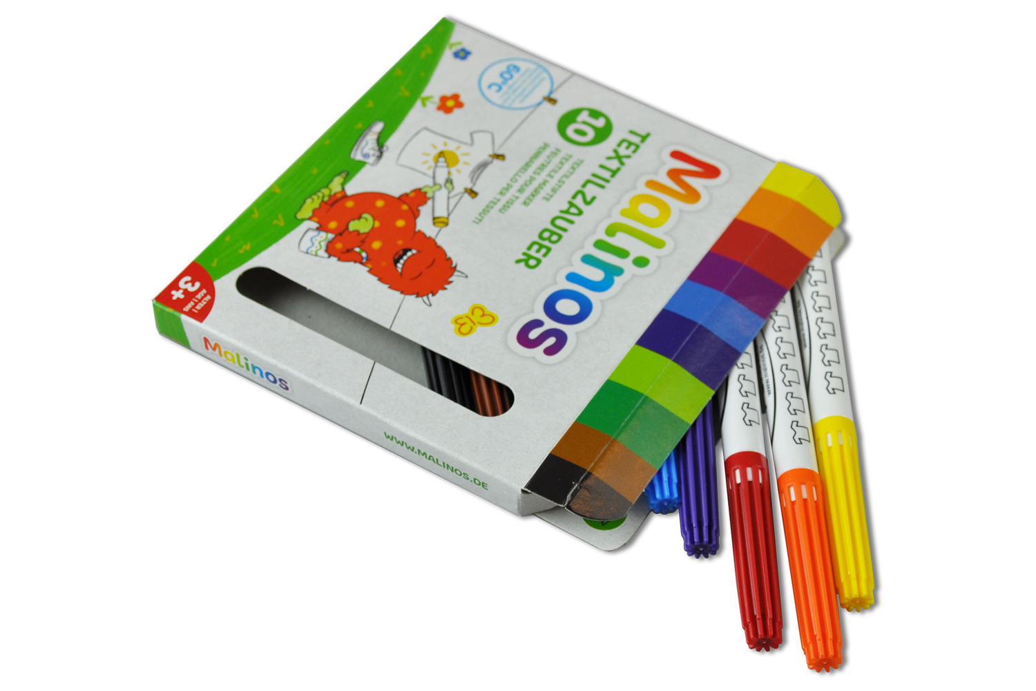 Фломастеры Malinos Textil имеют мягкие флоковые кончики, которые позволяют создавать как тонкие, так и широкие линии. Чернила специально разработаны для рисования по ткани, они не размазываются и быстро высыхают, что делает процесс рисования ещё более увлекательным. Однако будьте осторожны при стирке украшенных изделий: температура от 60 градусов и выше может смыть рисунки. Чтобы сохранить яркость шедевров, рекомендуется проутюжить изделие с тыльной стороны ткани на минимальной температуре.