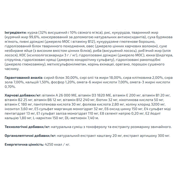 Глюкозамин, хондроитин, кальций и фосфор для здоровья суставов. Эти вещества в составе корма способствуют нормальному функционированию суставов опорно-двигательного аппарата. Комплекс лечебных трав и растений положительно влияет на растущий организм щенка. Богат биологически активными веществами и антиоксидантами, способствующими усилению защитных сил организма животного. Содержимое X.O.S. (Пробиотиков) помогает сохранить естественный баланс кишечной микрофлоры, способствует оптимальному усвоению питательных веществ и повышает иммунитет.