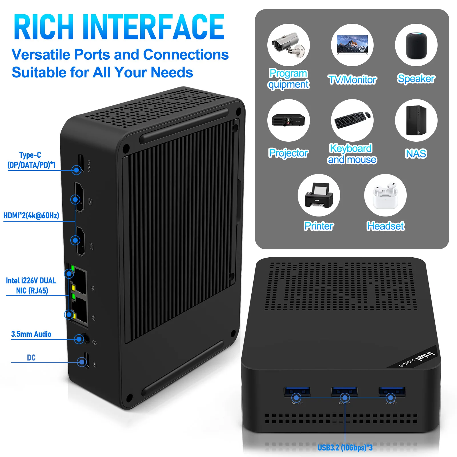 SZBOX 1264L-NAS — это не только мощное вычислительное устройство, но и элегантное и компактное решение для различных сценариев. На задней панели расположены 2 порта USB 2.0, 1 порт HDMI + 1 порт DisplayPort, 1 порт USB 3.0 + 1 порт Type-C, 3 порта LAN, 1 слот для карты TF и полный набор контактов для дополнительных возможностей подключения. Встроенные контакты включают 1 порт GPIO, 2 порта SYS_FAN, 1 порт COM, 1 порт AUTO_ON, 1 порт F_PANEL и 1 порт F_USB1, что повышает универсальность и функциональность устройства. Независимо от того, используется ли он для мультимедиа, сетевого хранилища (NAS) или других вычислительных задач, SZBOX 1264L-NAS — это надежный и динамичный выбор как для профессиональной, так и для домашней среды.