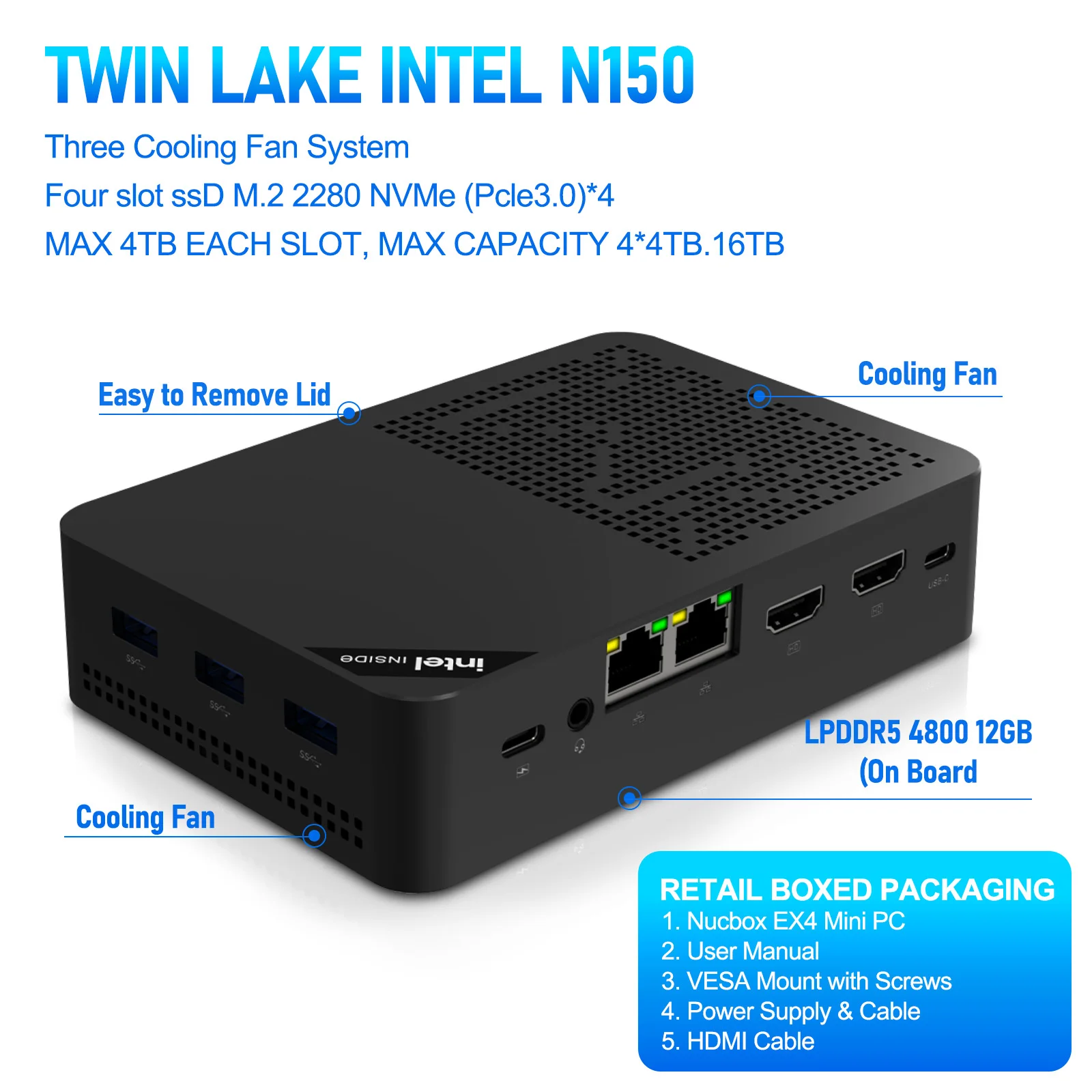 SZBOX 1264L-NAS — это исключительный barebone- и mini-PC, разработанный для обеспечения высочайшей производительности в мультимедийных приложениях. Этот компактный компьютер, работающий на процессоре Intel Twin Lake N150, оснащен мощным чипсетом SOC и графикой Intel® Graphics для яркого изображения. Наличие 1 модуля памяти SO-DIMM DDR5 4800 МГц обеспечивает плавную многозадачность и эффективную работу, поддерживая до 16 ГБ ОЗУ. Благодаря большой емкости хранения, SZBOX 1264L-NAS оснащен 2 слотами M.2 M Key с поддержкой PCIE и 6 интерфейсами SATA 3.0, что делает его идеальным для больших объемов хранения данных.