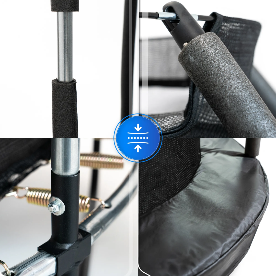 Прочная конструкция батута обеспечивает стабильность и безопасность во время прыжков. Толстые трубы, точные соединители, закрепленные винтами и прочные материалы гарантируют, что устройство прослужит много лет интенсивного использования.