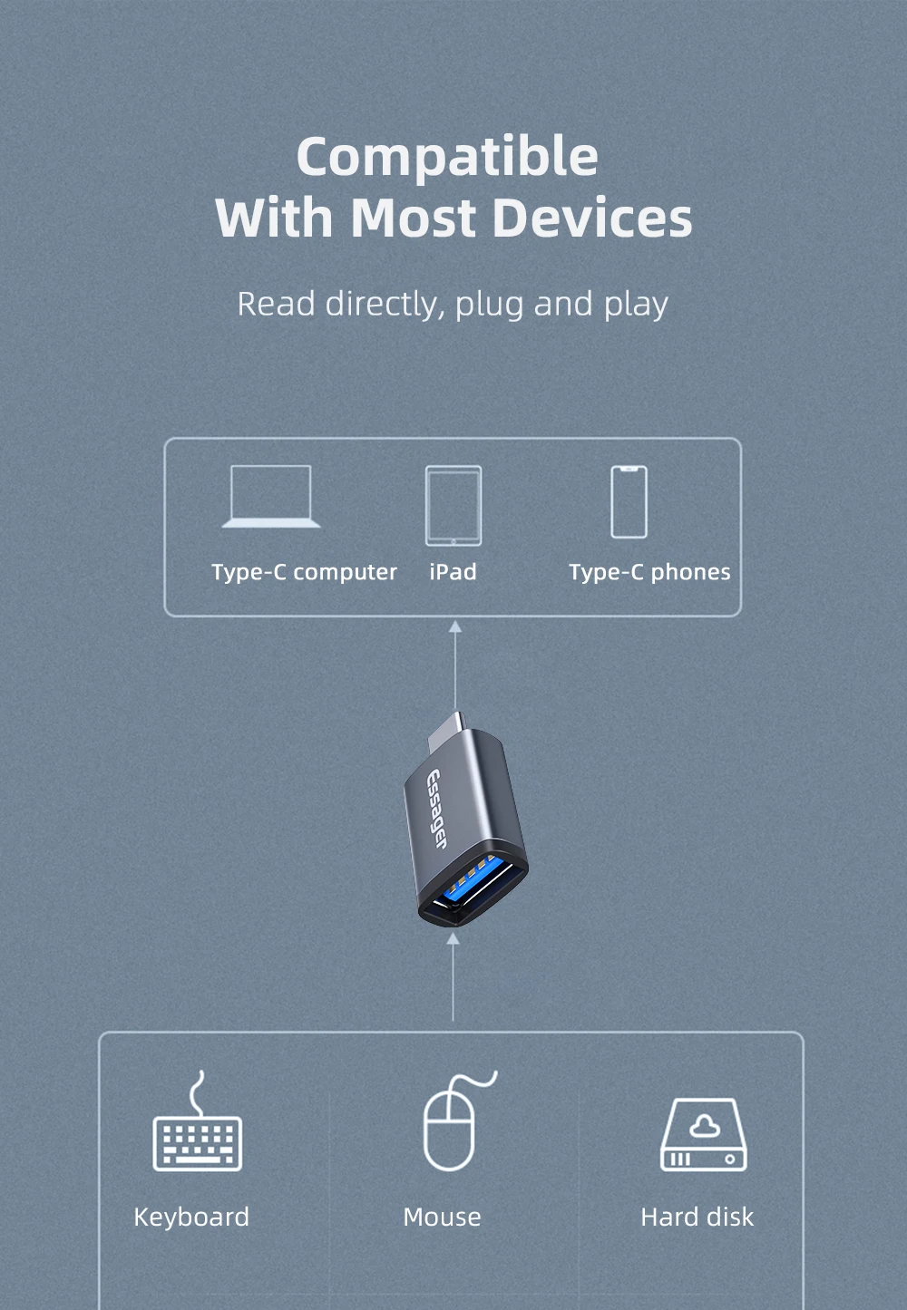 Компактный OTG адаптер Essager позволяет подключать USB-устройства к смартфонам, планшетам и ноутбукам с разъемом Type-C.