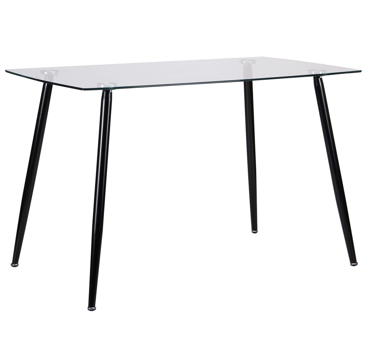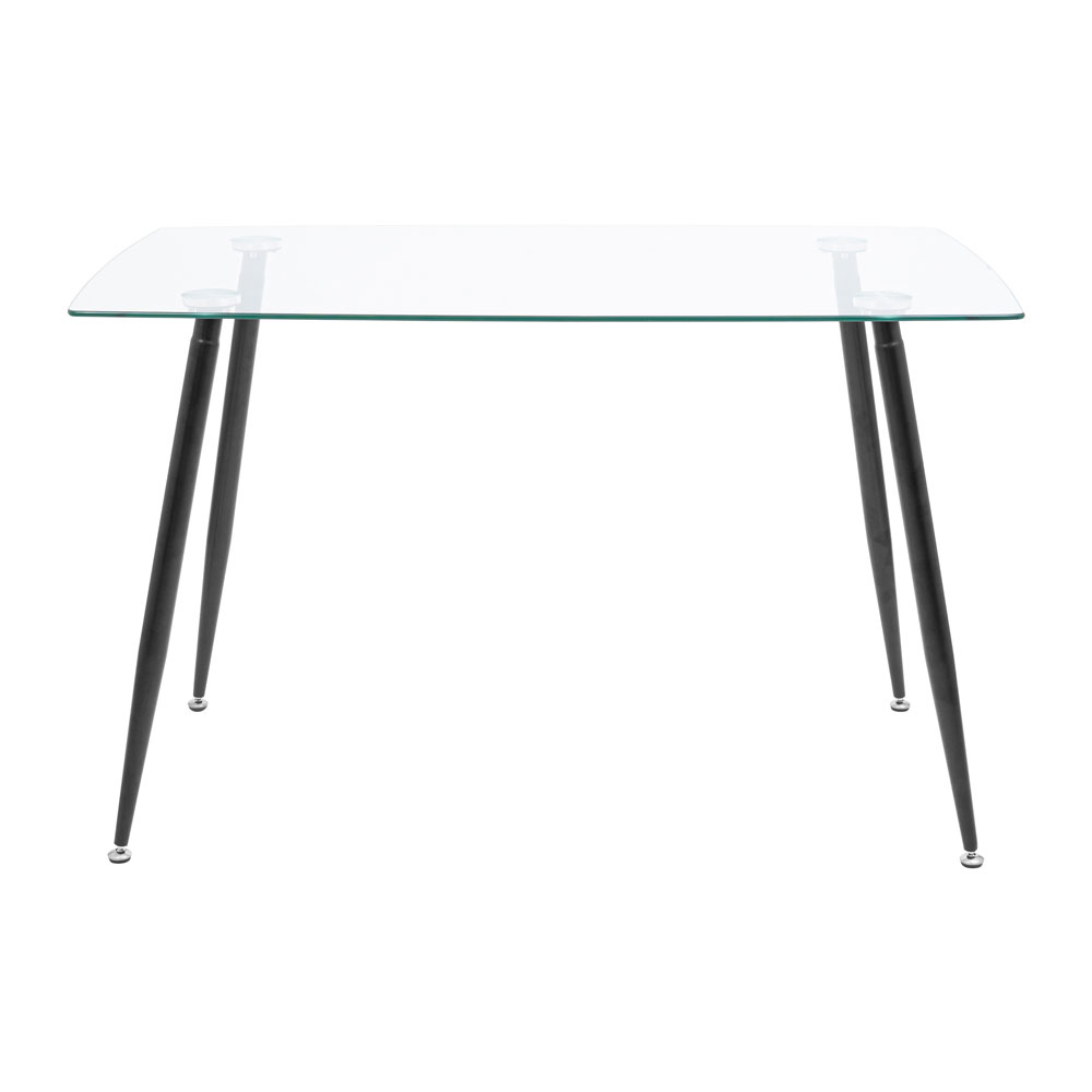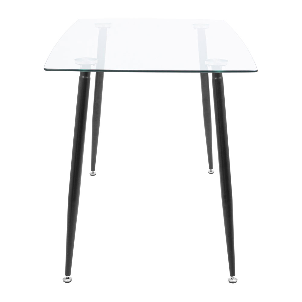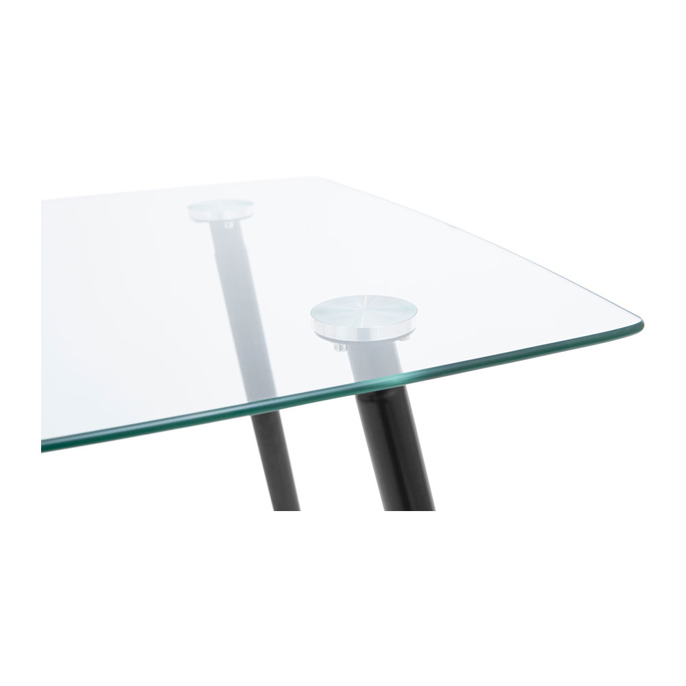 Столешница выполнена из прозрачного термозагартованного стекла, что не только придает ему современный вид, но и обеспечивает высокую прочность и безопасность. Толщина стекла в 10 мм гарантирует долговечность, а металлические ножки с черной порошковой покраской добавляют стабильности и стиля.