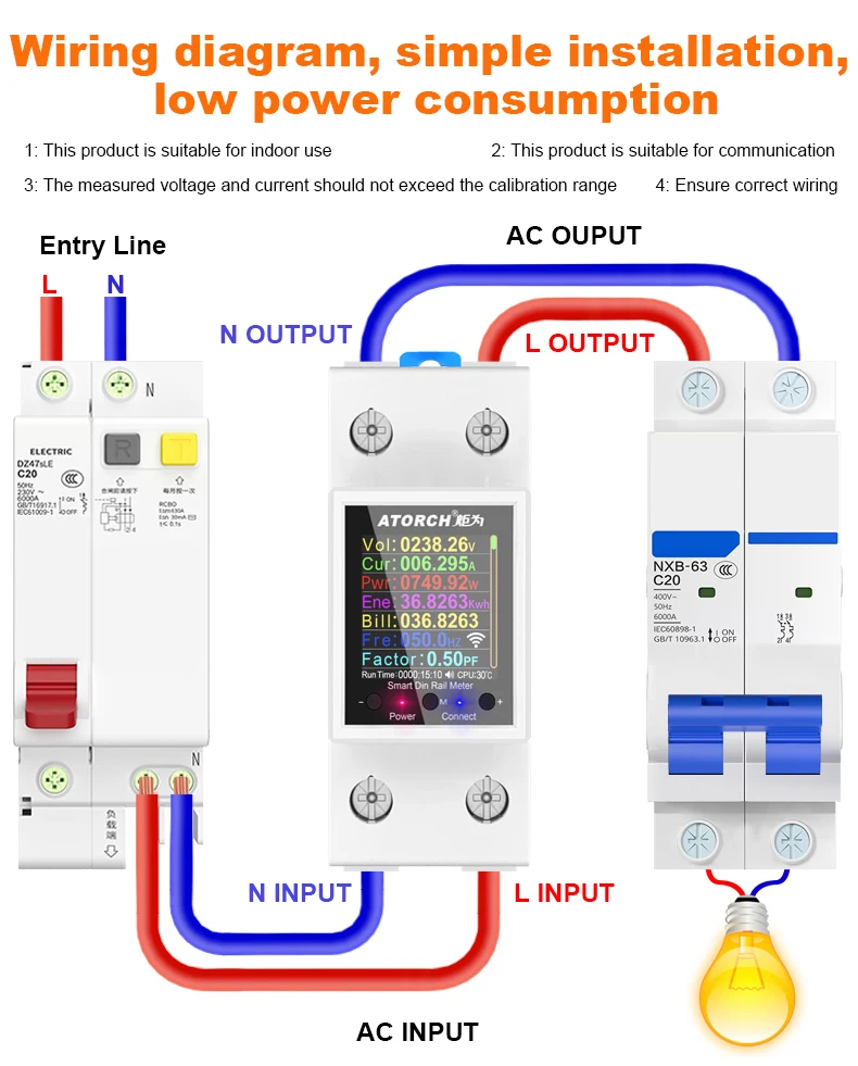 Когда этот счетчик включен впервые, необходимо сбросить встроенное реле магнитного удержания. В течение этого периода он будет включен более чем на десять секунд и будет поддерживать выход (защита от задержки). Только после завершения запуска и достижения интерфейса измерения можно включить предел превышения (например, функции защиты от перенапряжения, пониженного напряжения, перегрузки по току и перенапряжения) и достичь нормального рабочего режима данных измерений.