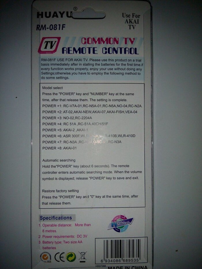 Универсальный пульт( 8 кодов)дистанционного управления к телевизорам Akai