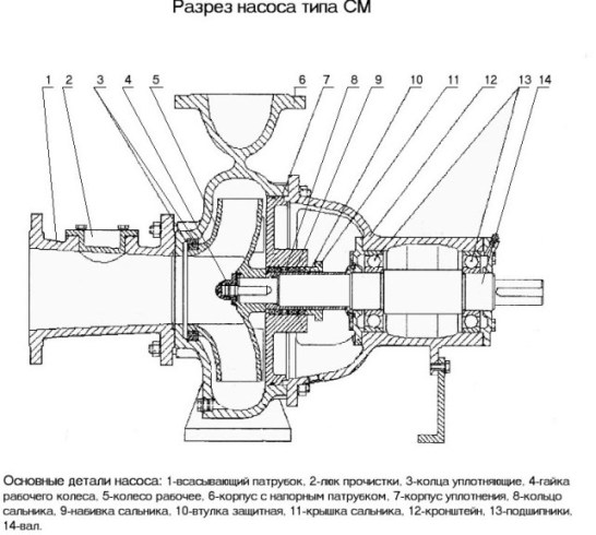 Сточно-массные насосы типа СМ - консольные горизонтальные, одноступенчатые с центробежным колесом закрытого типа.