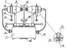 1- основание; 2, 3, 4, 11 - рукоятки; 5- кассета; 6 - патрон; 7 – объект; 8 – оптические головки; 9 - налобник; 10 – подбородник; 12 – вставка плавкая; 13 – рефлектор; 14 – гайка; 15 – стекло молочное