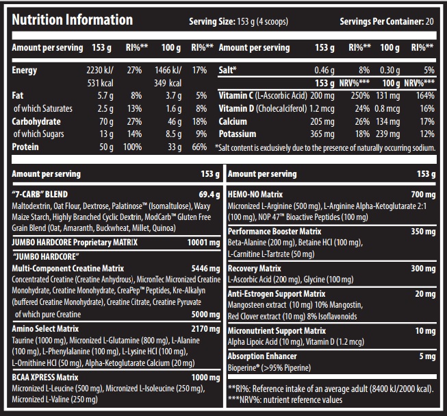 Jumbo Hardcore идет на шаг впереди простых гейнеров на основе декстрозы и мальтодекстина. Вы получите качественные калории и дополнительные компоненты!