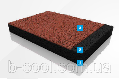 1. Праймер, нанесенный на подготовленное основание (асфальт или бетон) 2. Базовый слой 11 мм, состоящий из резиновой крошки и полиуретанового связующего 3. Финишный слой 2 мм, нанесенный распылением, смесь специального спрей-компонента и EPDM гранул 0,5-1,5 мм |