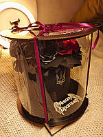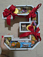 Почну з того, що це дуже ефектний варіант подарунку. Але допоки ви не покладете туди щось і не захочете поставити цифру вертикально, ну бо вона ж мала б стояти вертикально. Тоді ця кришечка просто відлітає, бо на таку площу фігури занадто мало кріплень. Тому ті стрічки, які ви бачите на фото, - це не свідома прикраса, це вимушений крок, бо що ще можна знайти вдома в 12 ночі, коли на ранок пакуєш подарунок? Без стрічок цифра має суттєво кращий вигляд, але вертикально її тримати не можна, бо кришечка відлітає (ні, я не поклала туди багато солодощів, вона просто не тримається).