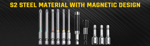 Магнітний алюмінієвий корпус та ковані біти з матеріалу S2 (60HRC) означають набагато більший термін служби, ніж пластиковий корпус та біта з матеріалу CRV. Завдяки міцній магнітній конструкції всі викрутки можна зберігати в коробці впорядковано і не потрібно турбуватися про зникнення деталей. Підвищена ефективність при загвинчуванні.