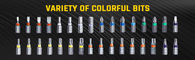 У коробці використовується конструкція, що спливає, що дозволяє легко виймати коробку для зберігання під час роботи, а біти позначені різними кольорами в залежності від їх типу і довжини, що дозволяє легко зробити правильний вибір.