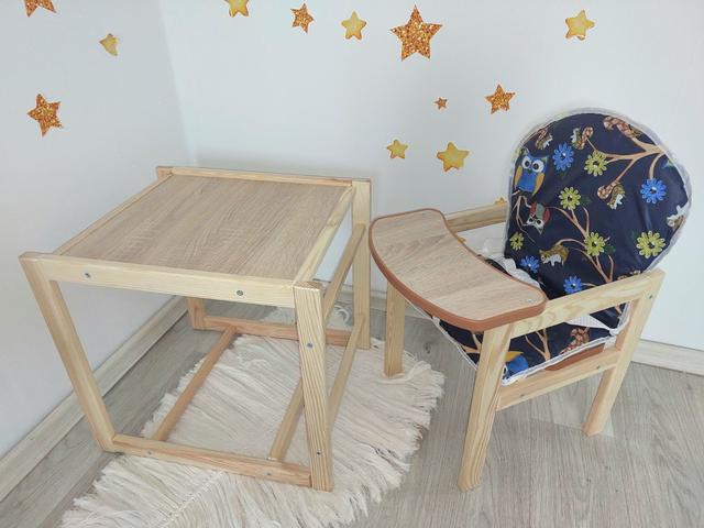 Дерев'яний стілець для годування може трансформуватися власне високого стільчика для годування з індивідуальною стільницею в стіл парту для годування, ігор та занять.