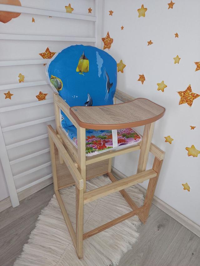 Дерев'яний стільчик для годування може трансформуватися власне з високого стільчика для годування з індивідуальною стільницею в стіл парту для годування, ігор та занять.