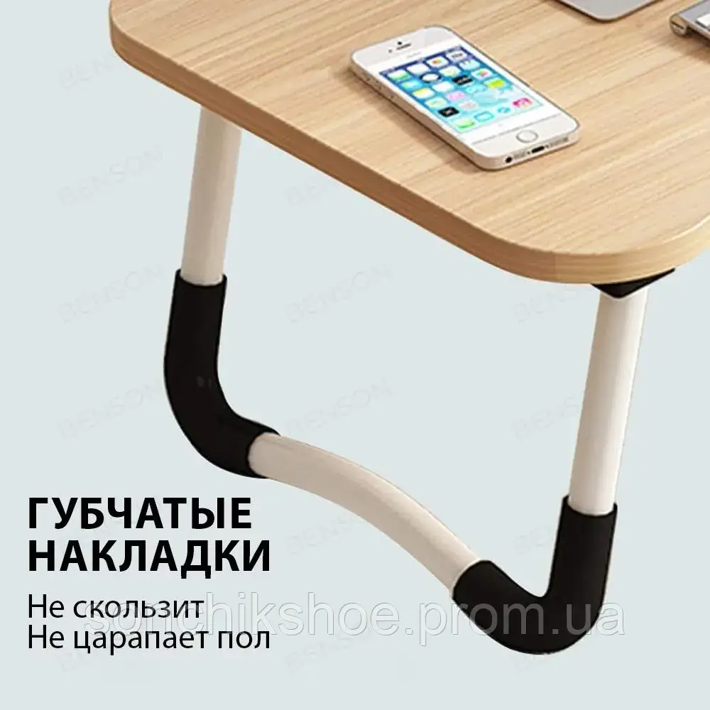 Комп'ютерний столик оснащений ніжками з протиковзким покриттям, які забезпечують надійну фіксацію на ліжку, дивані або будь-якій іншій поверхні. У нього є поглиблення для планшета, що підходить для пристрою будь-якого розміру, що дає змогу комфортно дивитися фільми або мультфільми, не утримуючи його в руках. Також у комплект входить знімний підсклянник, щоб ваш напій завжди був під рукою в процесі роботи або відпочинку. Легкі металеві ніжки складаються, що значно спрощує зберігання столика - він легко поміщається за ліжком або в багажнику автомобіля. Столик виконаний з якісних матеріалів, таких як дерево, метал і пластик, і важить не більше 2.5 кг. Стильний дизайн і світлий бежевий колір стільниці роблять його універсальним для будь-якого інтер'єру.